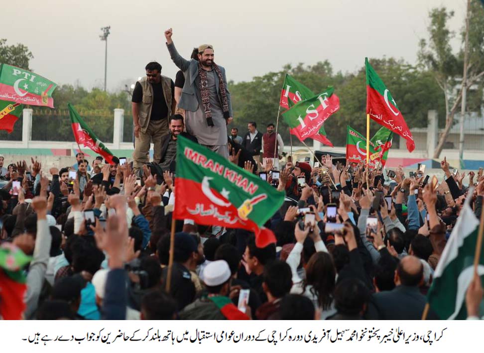 Chief Minister Khyber Pakhtunkhwa Muhammad Sohail Afridi while responding to the audience by raising his hands in a public welcome during his visit to Karachi.